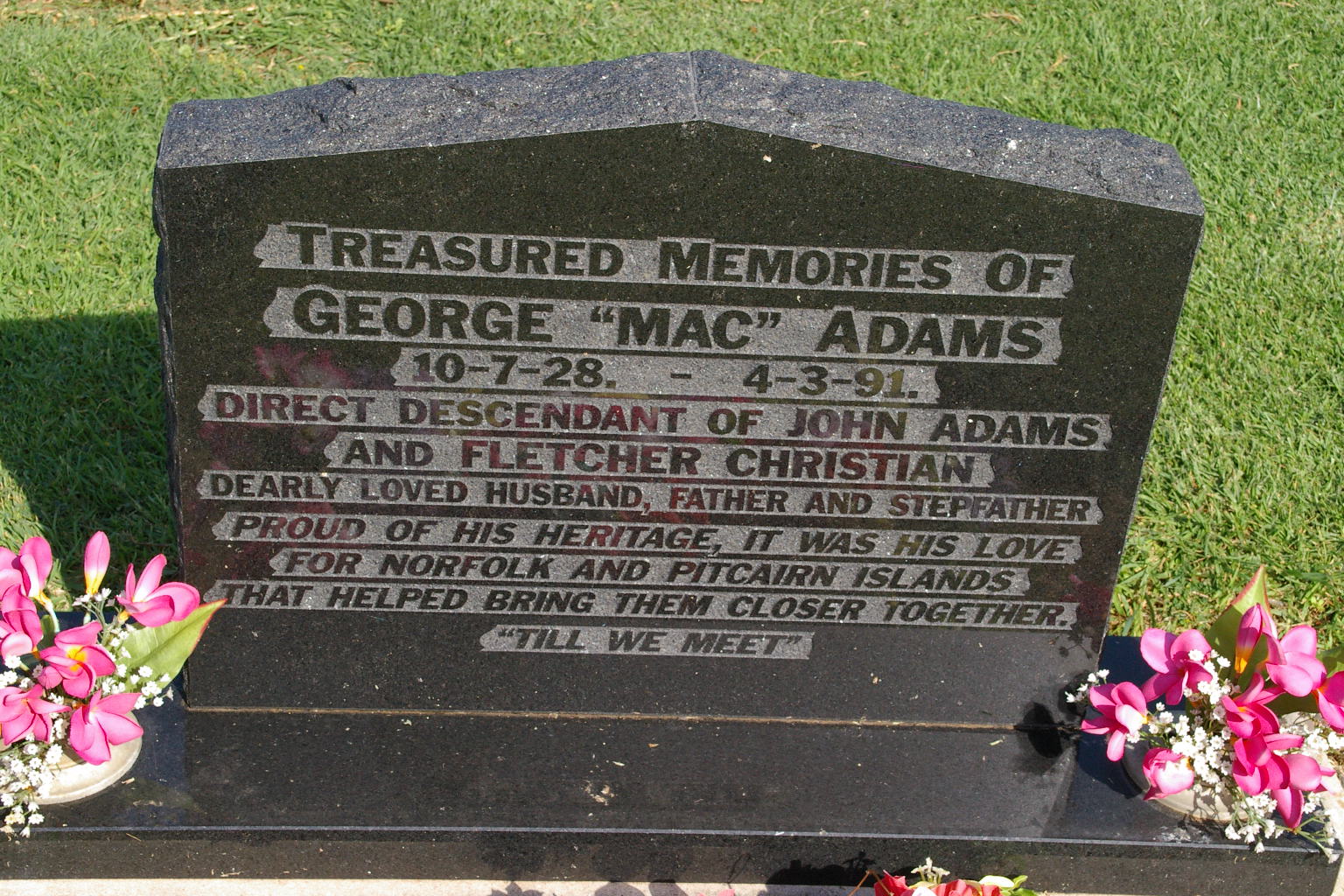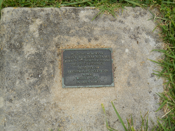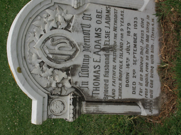 | ADAMS OBE | Thomas E | photo | 16/07/1879 | 2/09/1935 | Elsie J Adams | Pastor of the Methodist Church Norfold Island for 9 years | ||
