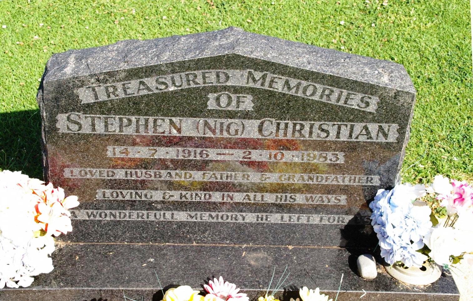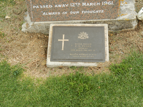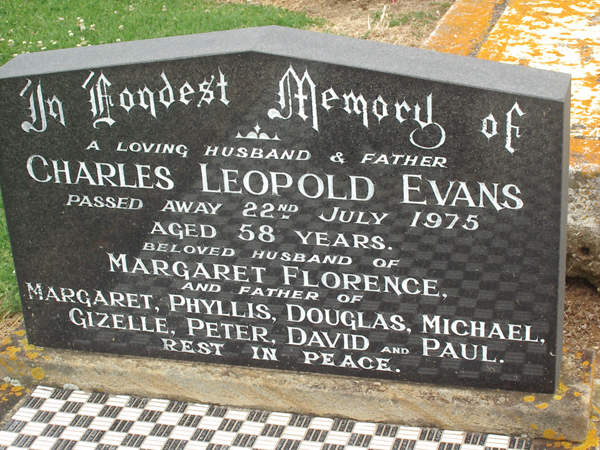 | EVANS | Charles Leopold | photo | 22/07/1975 | 58 | Margaret Florence | father of Margaret, Phyllis, Douglas, Michael, Gizelle, Peter, David and Paul | ||