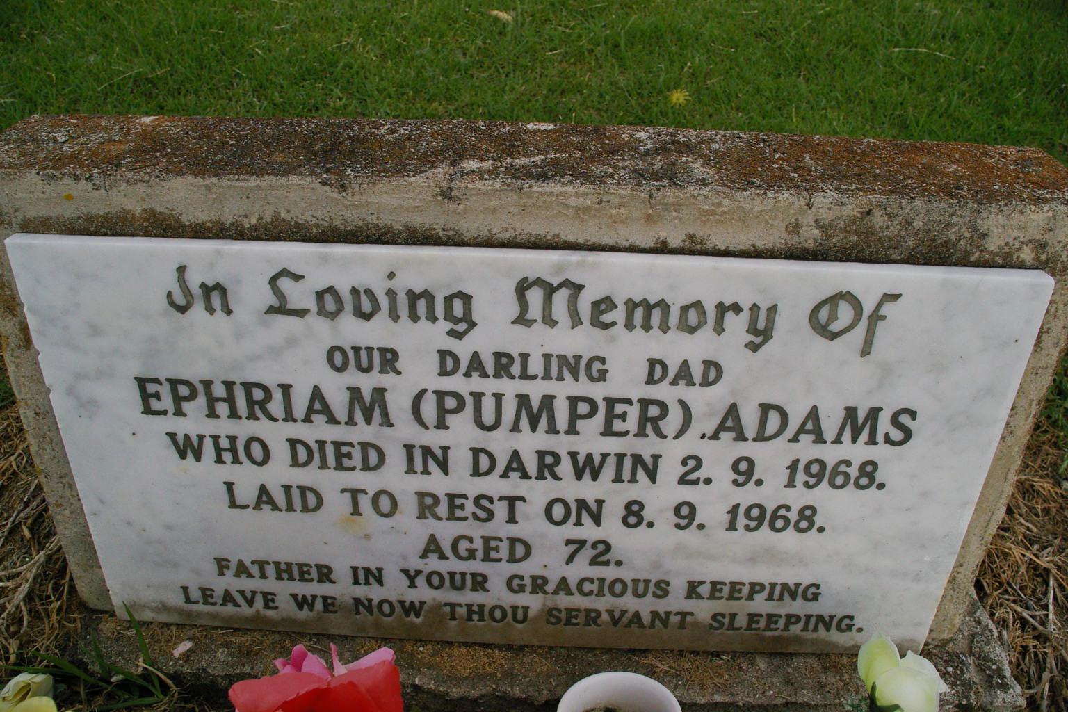 | ADAMS | Ephriam (Pumper) | photo | 2/09/1968 | 72 | Died in Darwin laid to rest on 8/9/1968 | |||