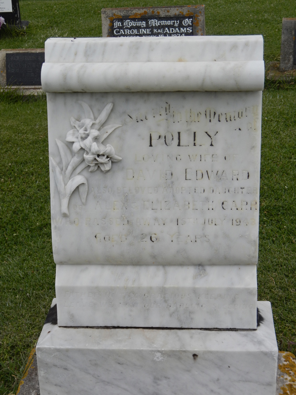 | EDWARD | Polly | photo | 15/07/1943 | 26 | David Edward | Adopted daughter of Alex & Elizabeth Carr | ||
