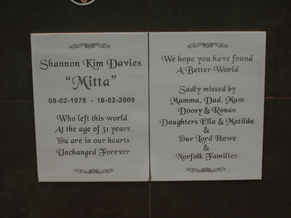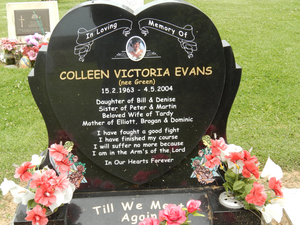 | EVANS | Colleen Victoria | photo | 15/02/1963 | 4/05/2004 | Tardy | nee Green, daughter of Bill & Denise, sister of Peter & Martin, mother of Elliott, Brogan & Dominic | ||