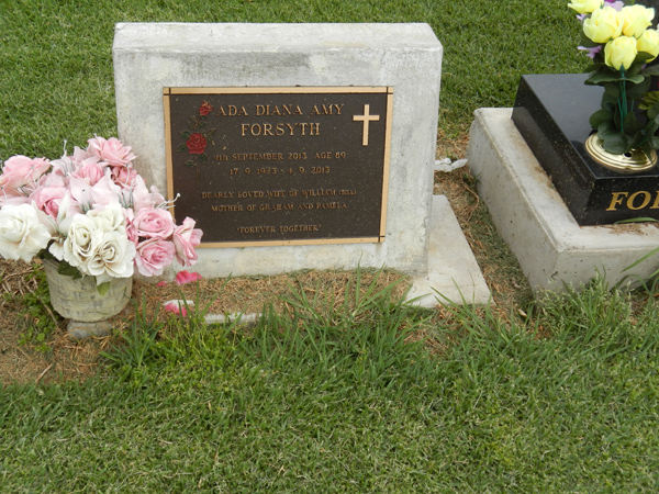 | FORSYTH | Ada Diana Amy | photo | 4/09/2013 | 89 | William (Bill) | mother of Graham & Pamela | ||