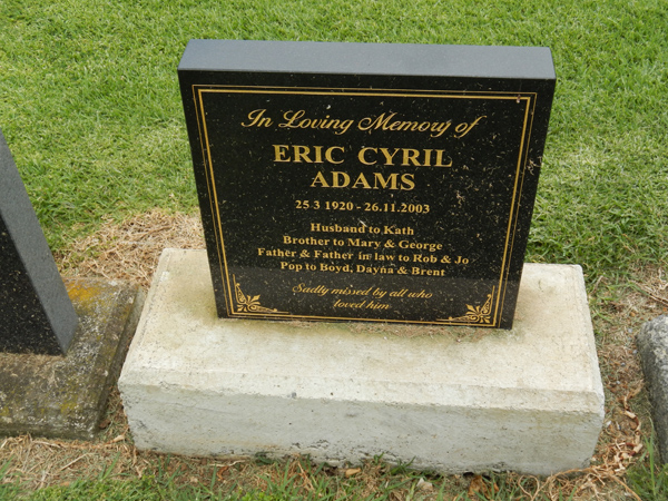 | ADAMS | Eric Cyril | photo | 25/03/1920 | 26/11/2003 | Kath | brother to Mary & Georgee, father & father in law to Rob & Jo, Pop to Boyd, Dayna & Brent | ||