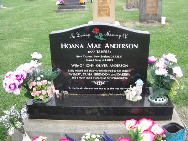 | ANDERSON | Hoana Mae | photo | 21/05/1937 | 4/04/2009 | John Oliver Anderson | nee Tahere, born Thames, New Zealand, missed by children Wendy, Tania, Brendon and Darren | ||
