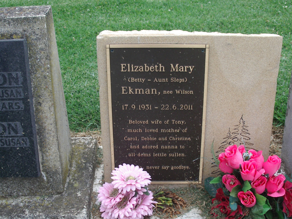 | EKMAN | Elizabeth Mary (Betty - Aunt Sleps) | photo | 17/09/1931 | 22/06/2011 | Tony | mother of Carol, Debbie and Christine | ||