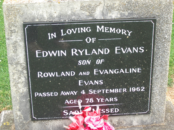 | EVANS | Edwin Ryland | photo | 4/09/1962 | 78 | son of Rowland and Evangaline Evans | |||