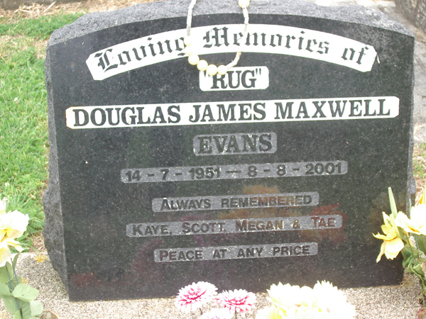 | EVANS | Douglas James Maxwell | photo | 14/07/1951 | 8/08/2001 | always remembered Kaye, Scott, Megan & Tae | |||