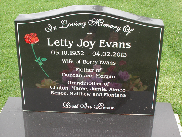 | EVANS | Letty Joy | photo | 5/10/1932 | 4/02/2013 | Borry Evans | mother of Duncan and Morgan, grandmother of Clinton, Maree, Jamie, Aimee, Renee, Matthew and Montana | ||