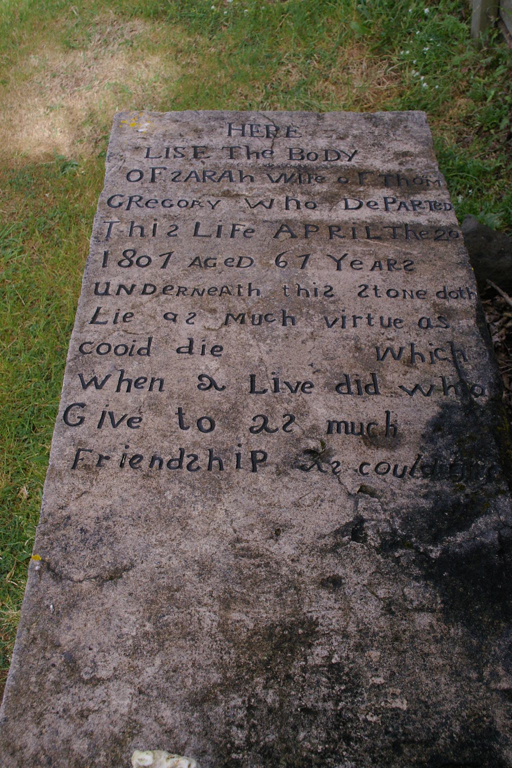 | GRECORY | Sarah | photo | 20/04/1807 | 67 | Wife of Thomas Gregory | |||