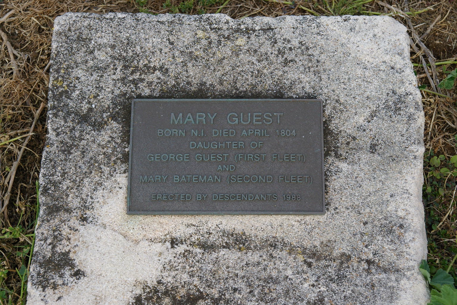 | GUEST | Mary | photo | ?/04/1804 | Daughter of George (First Feet)and Mary nee Bateman ( Second Fleet)Erected by Descendants 1988 | ||||