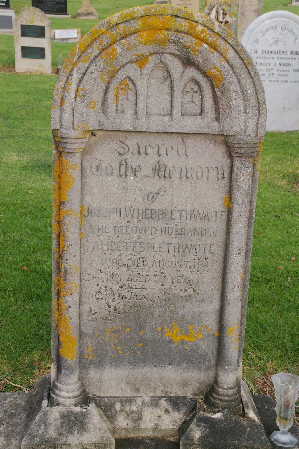 | HEBBLETHWAITE | Joseph | photo | 11/08/1881 | 33 | Beloved husband of Alice Hebblethwaite | |||