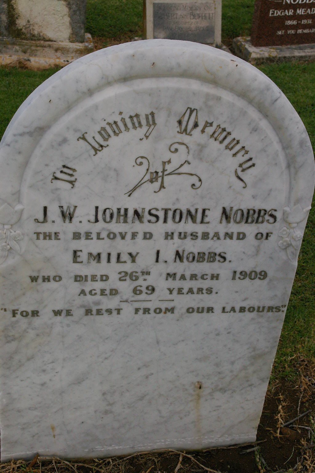 | NOBBS | J.W.Johnstone | photo | 26-03-1909 | 69 | Beloved husband of Emily I. Nobbs | |||