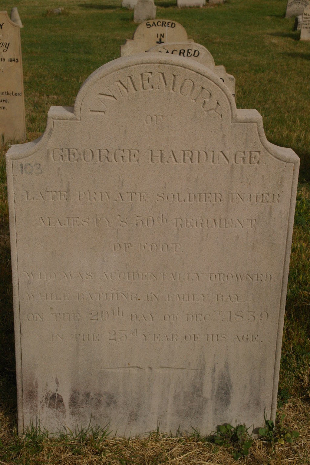 | HARDINGE | George | photo | 20/12/1839 | 25 | Accidentally drowned while bathing in Emily Bay | |||
