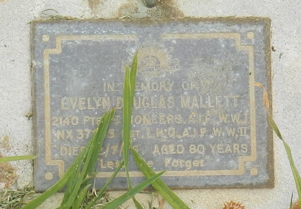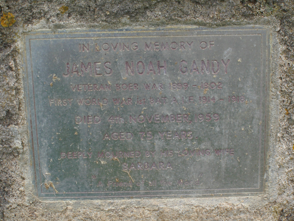 | GANDY | James Noah | photo | 04-11-1959 | 75 | Barbara | Veteran Boer War 1899-1902, 1st World War 1st Bat AIF 1914-1918 | ||