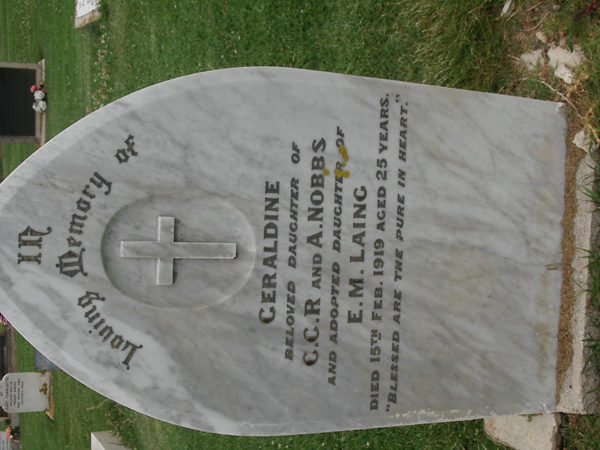 | NOBBS | Geraldine | photo | 15-02-1919 | 25 | daughter of CCR & A Nobbs, adopted daughter of E M Laing | |||