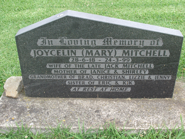 | MITCHELL | Joycelin (Mary) | photo | 28-06-1918 | 24-03-1999 | Jack Mitchell | mother of Janice & Shirley, grandmother of Brad, Christian, Lizzie & Jenny, sister of Eric & kik | ||