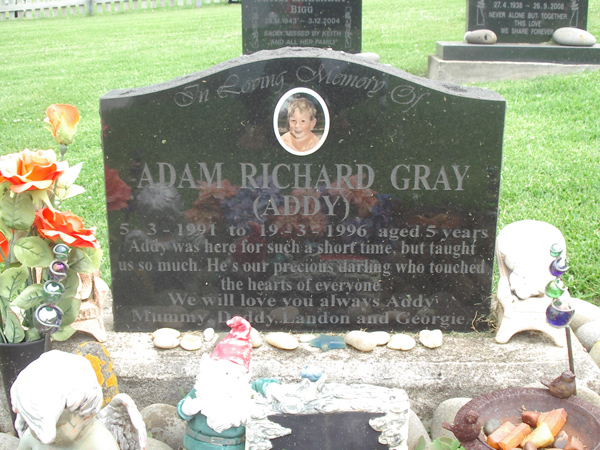 | GRAY | Adam Richard (Addy) | photo | 05-03-1991 | 19-03-1996 | 5 | love you always Addy, Mummy, Daddy, Landon and Georgie | ||