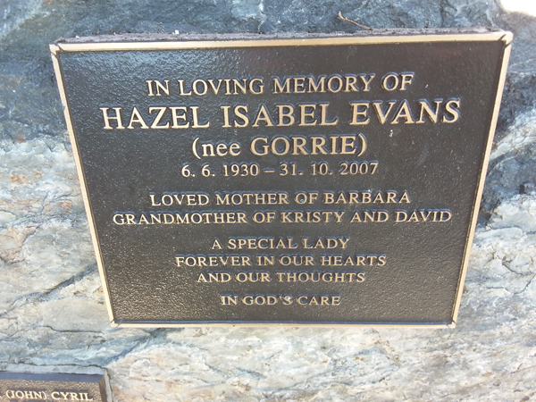 | Evans | Hazel Isabel | photo | 6/06/1930 | 31/10/2007 | nee Gorrie m/o Barbara gm/o Kristy & David | ||