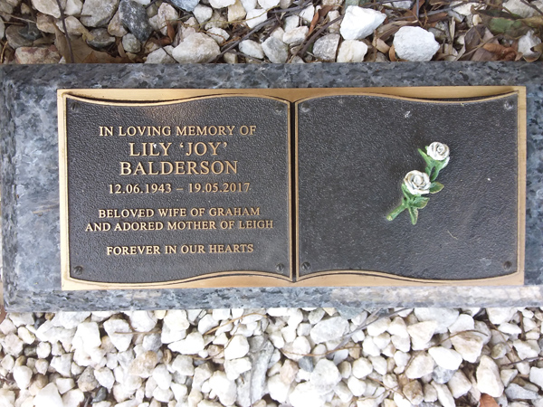 | Balderson | Lily 'Joy' | photo | 12/06/1943 | 19/05/2017 | w/o Graham m/o Leigh | ||