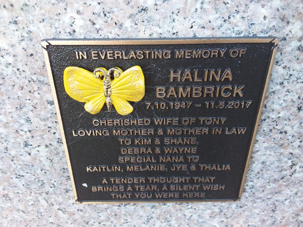| Bambrick | Halina | photo | 7/10/1947 | 11/05/2017 | w/o Tony m/o & mother in Law to Kim & Shane, Debra & Wayne | ||