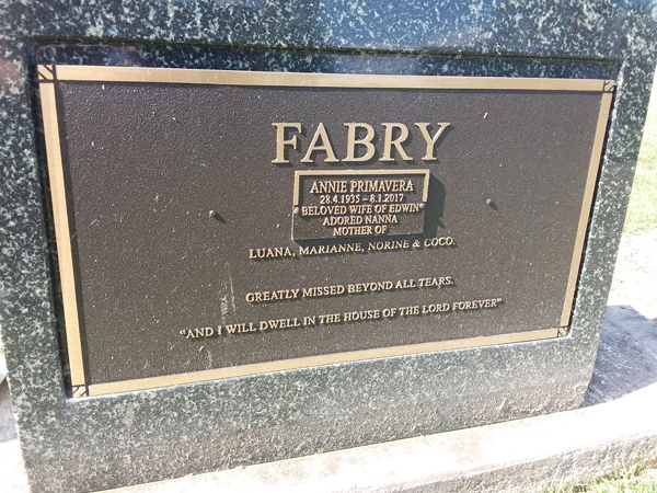 | Fabry | Annie Primavera | photo | 28/04/1935 | 8/01/2017 | w/o Edwin m/o Luana, Marianne, Norine & Coco | ||