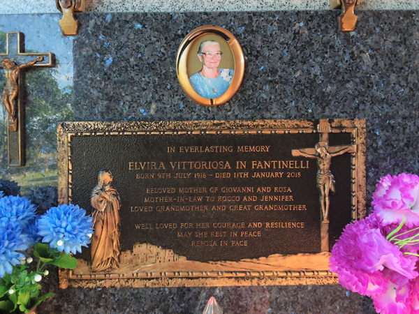 | Fantinelli | Elvira Vittoriosa In | photo | 9/07/1916 | 11/01/2018 | m/o Giovanni & Rosa mother-in-law to Rocco & Jennifer | ||