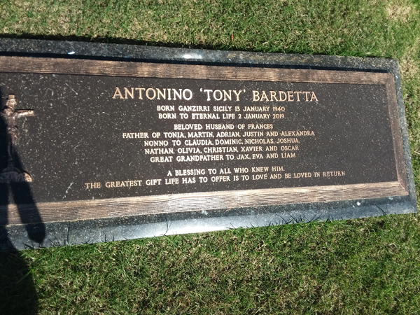 | Bardetta | Antonino 'Tony' | photo | 13/01/1940 | 2/01/2019 | Born Ganzirri Sicily h/o Frances f/o Tonia, Martin, Adrian, Justin & Alexandra | ||