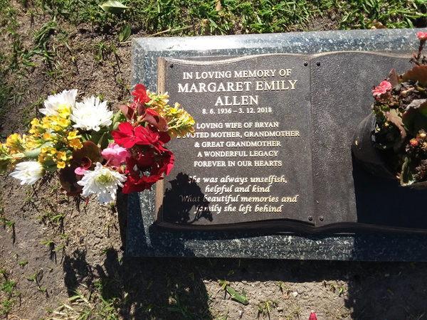 | Allen | Margaret Emily | photo | 8/06/1936 | 3/12/2018 | w/o Bryan | ||