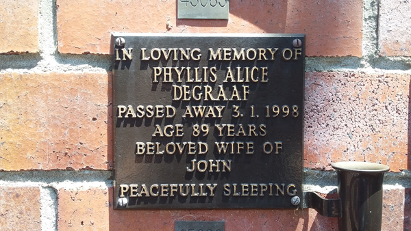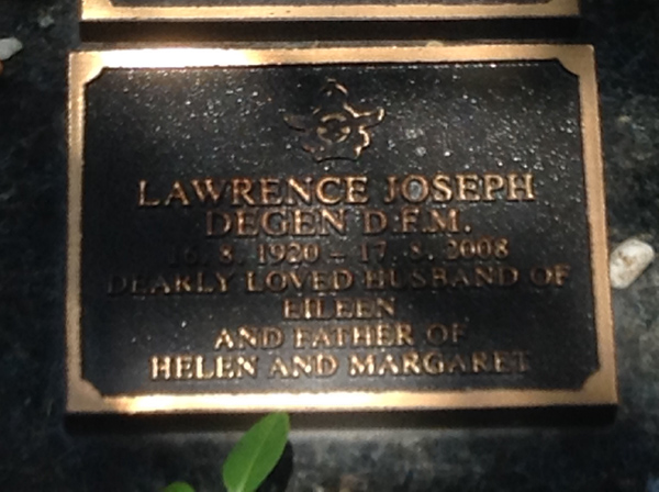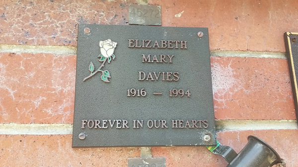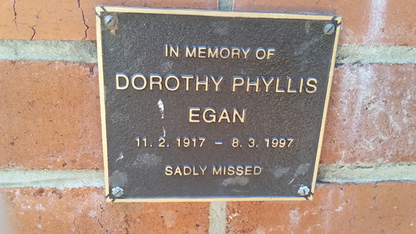 | Egan | Dorothy Phyllis | photo | 11/02/1917 | 8/03/1997 | w/o Harold | ||