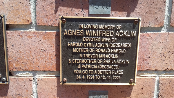 | Acklin | Agnes Winifred | photo | 24/04/1924 | 12/11/2009 | |||