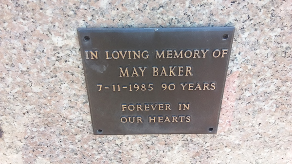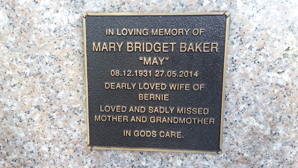 | Baker | Mary Bridget 'May' | photo | 8/12/1931 | 27/05/2014 | w/o Bernie | ||