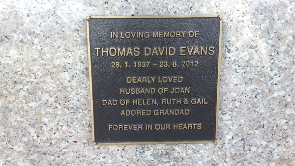 | Evans | Thomas David | photo | 28/01/1937 | 23/08/2012 | h/o Joan f/o Helen, Ruth & Gail | ||