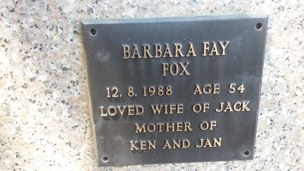 | Fox | Barbara Fay | photo | 12/08/1988 | 54 | w/o Jack m/o Ken & Jan | ||