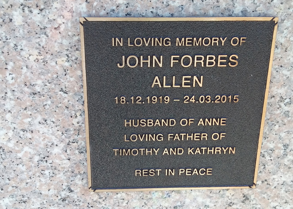 | Allen | John Forbes | photo | 18/12/1919 | 24/03/2025 | h/o Anne f/o Timothy & Kathryn | ||