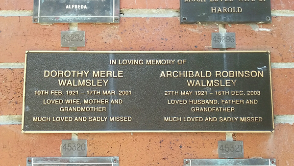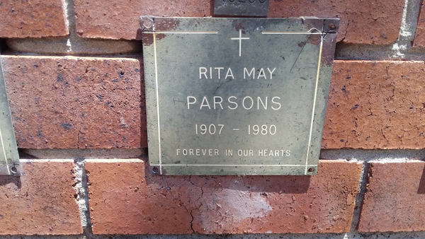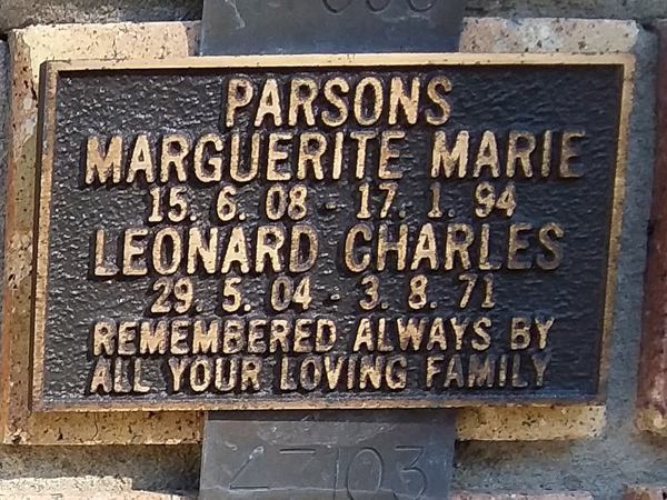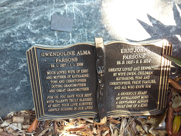| Parsons | Gwendoline Alma | photo | 24/01/1927 | 1/01/2008 | w/o Eric m/o Katharine, Toni & Christopher | ||