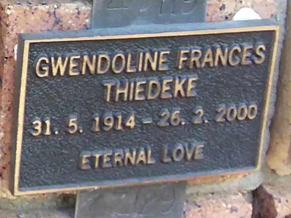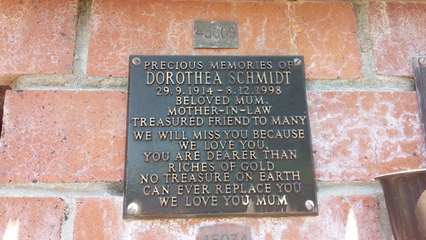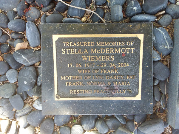 | Wiemers | Stella McDermott | photo | 17/06/1917 | 29/04/2004 | w/o Frank m/o Lyn, Darcy, Pat, Frank, Norma & Maria | ||