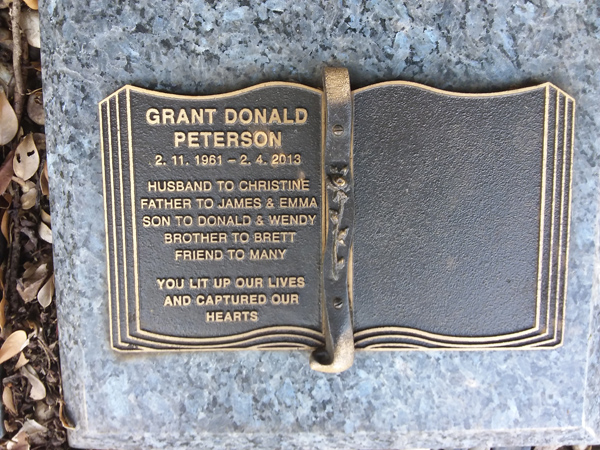 | Peterson | Grant Donald | photo | 2/11/1961 | 2/04/2013 | h/o Christine f/o James & Emma s/o Donald & Wendy b/o Brett | ||