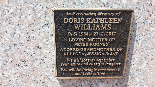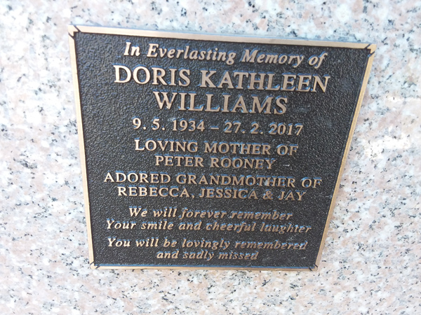 | Williams | Doris Kathleen | photo | 9/05/1934 | 27/02/2017 | m/o Peter Rooney gm/o Rebecca, Jessica & Jay | ||