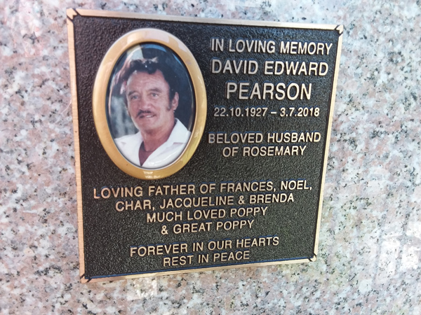 | Pearson | David Edward | photo | 22/10/1927 | 3/07/2018 | h/o Rosemary f/o Frances, Noel, Char, Jacqueline & Brenda | ||