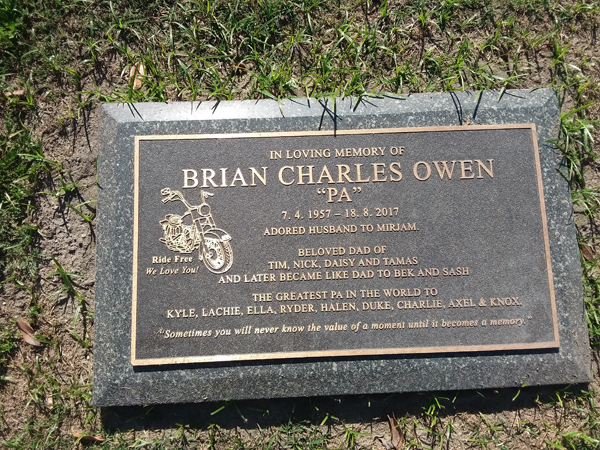 | Owen | Brian Charles 'Pa' | photo | 7/04/1957 | 18/08/2017 | h/o Mirjam f/o Tim, Nick, Daisy & Tamas | ||
