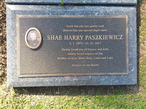 | Paszkiewicz | Shae Harry | photo | 2/01/1977 | 11/12/2017 | s/o Gaynor & John stepson of Jim b/o Kim, Dean, Amy, Laine & Luke | ||