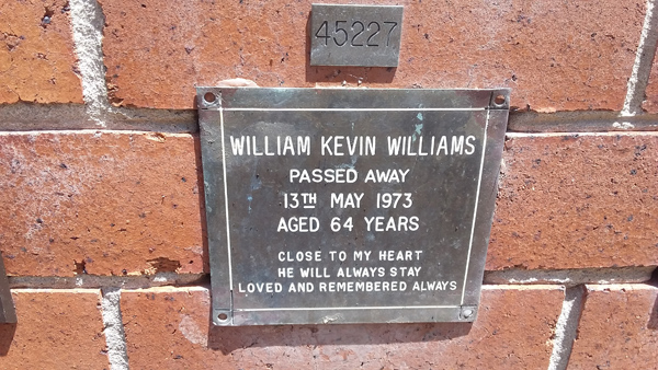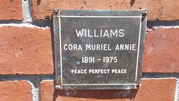 | Williams | Cora Muriel Annie | photo | 0/0/1891 | 0/0/1975 | 94 | h/o Irene f/o Glenda, Brian & Raymond | |