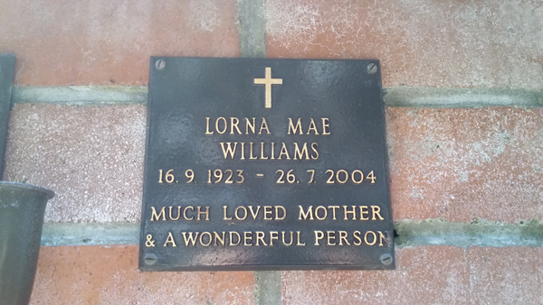 | Williams | Lorna Mae | photo | 16/09/1923 | 26/07/2004 | |||