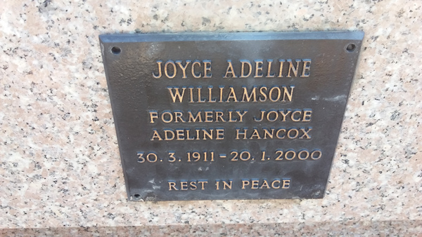 | Williamson | Joyce Adeline | photo | 30/03/1911 | 20/01/2000 | Formerly Joyce Adeline Hancox | ||