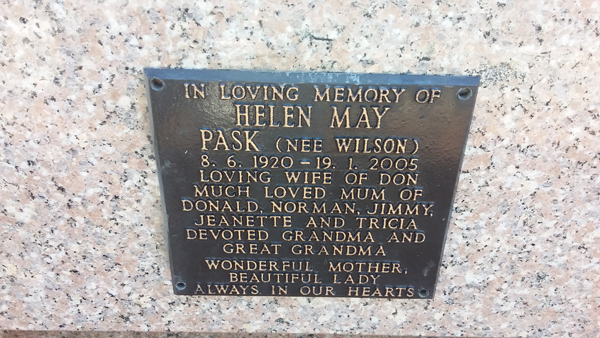 | Pask | Helen May | photo | 8/06/1920 | 19/01/2005 | nee Wilson w/o Don m/o Donald, Norman, Jimmy, Jeanette & Tricia | ||