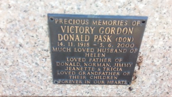 | Pask | Victory Gordon Donald (Don) | photo | 14/11/1918 | 3/06/2000 | h/o Helen f/o Donald, Norman, Jimmy, Jeanette & Tricia | ||