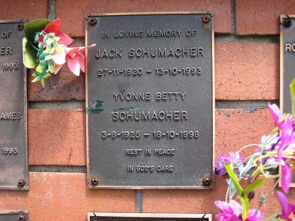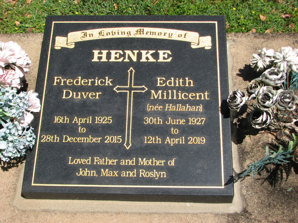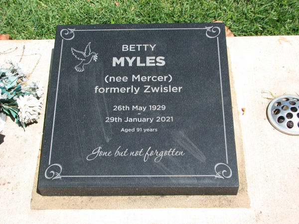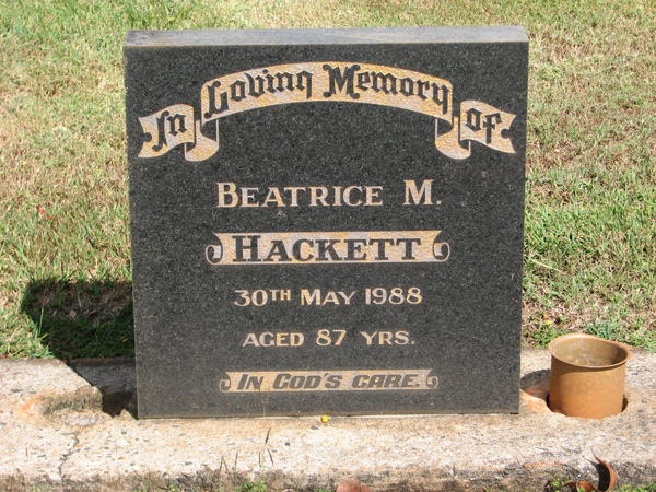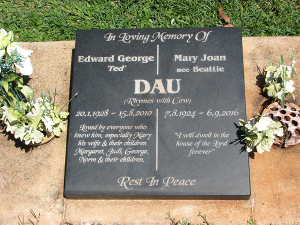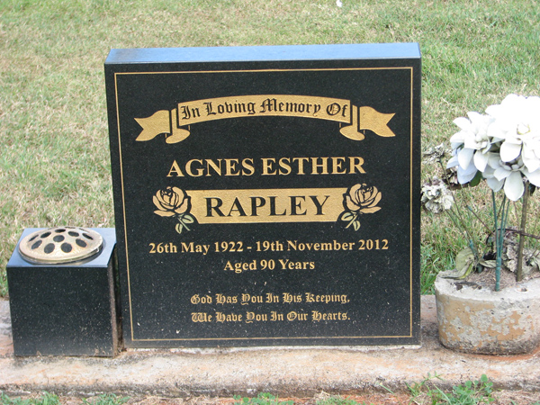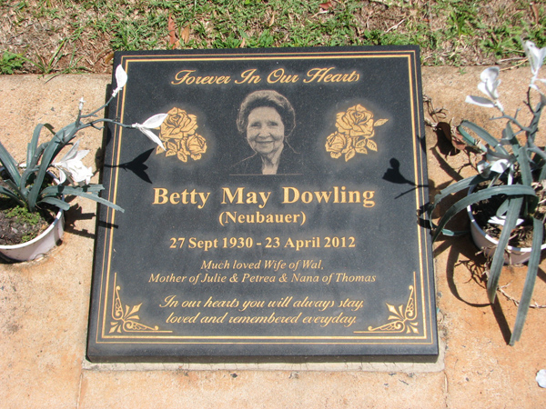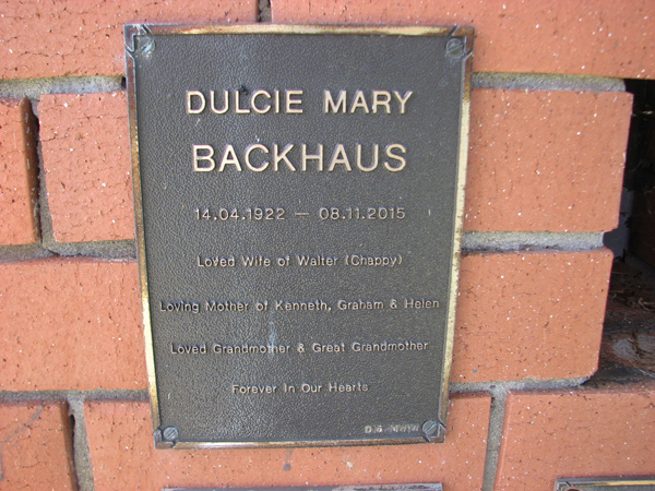 | Backhaus | Dulcie Mary | photo | 14/04/1922 | 8/11/2015 | w/o Walter 'Chappy', m/o Kenneth, Graham & Helen | |
