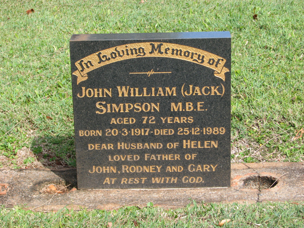 | Simpson MBE | John William 'Jack' | photo | 20/03/1917 | 25/12/1989 | 72 | h/o Helen, f/o John, Rodney and Gary |