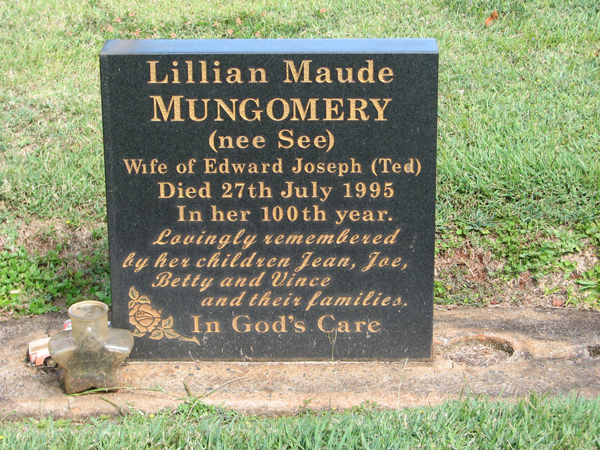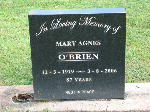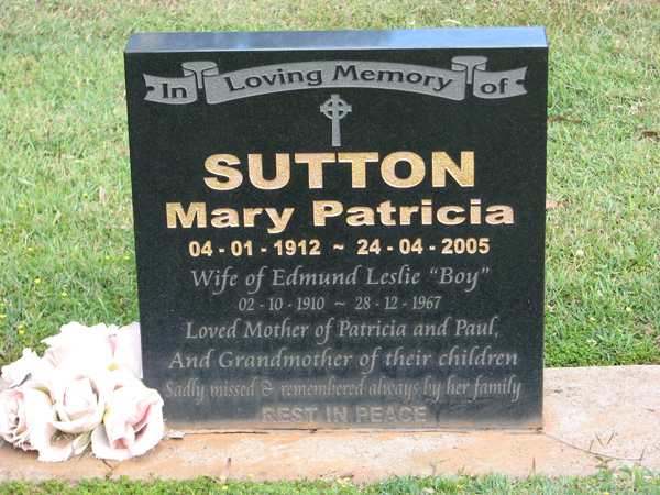 | Sutton | Mary Patricia | photo | 4/01/1912 | 24/04/2005 | w/o Edmund Leslie 'Boy' born 2-10-1910 died 28 Dec 1967, m/o Patricia & Paul | |