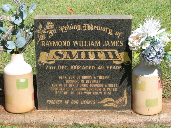 | Smith | Raymond William James | photo | 7/12/1992 | 49 | s/o Harry & Thelma, h/o Beverley, f/o Shane, Deborah & Brett, b/o Lorraine, Brenda & Peter | |